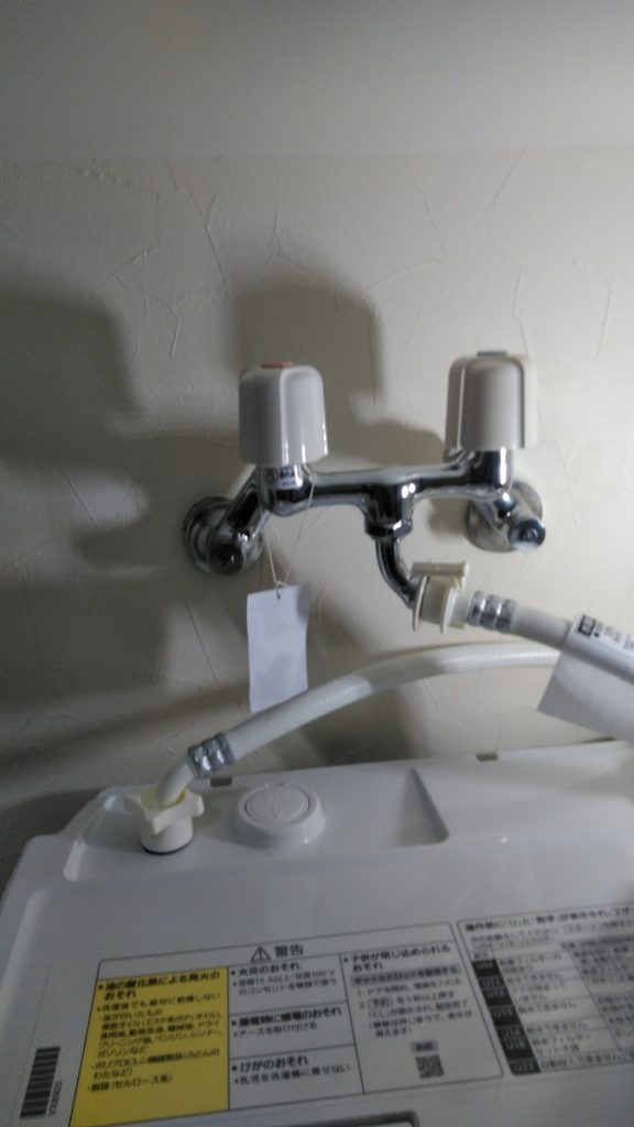 本日は提携会社からの依頼で洗濯機を新しく付けたが蛇口から水漏れしているので見て欲しいとの依頼で行ってきました。点検するとハンドルの根元とパイプの付け根からじんわり水漏れしている状態です。本来ならハンドル部を外し中のパッキンを交換したい所なんですがハンドルのネジが固着してビクとも動きません・・年数が経って完全に固まってます。本体交換しないと改善しない旨を提携会社に相談すると交換の了承を得たので入居者の方もすぐに洗濯出来ると大変喜ばれていました。