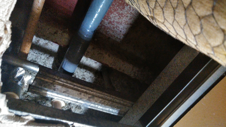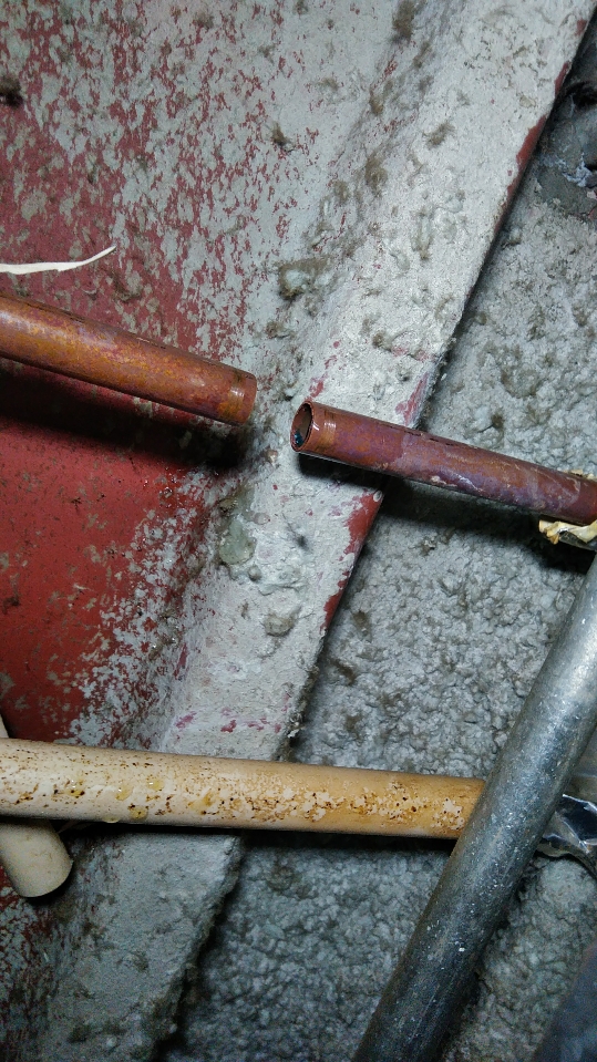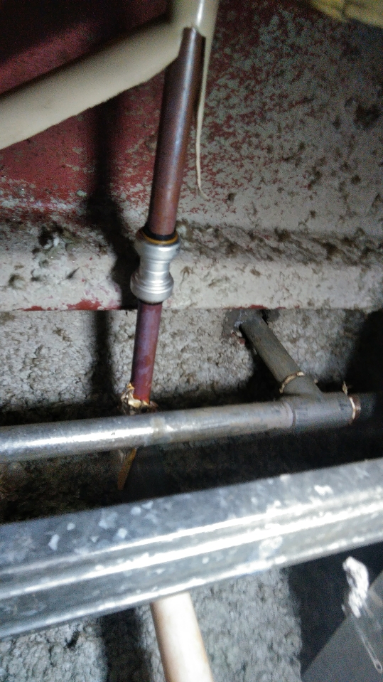 本日は管理会社からの依頼で賃貸アパートの天井から水漏れしているので見て欲しいとの件で行ってきました。拝見すると台所の換気扇の上からポタポタ継続的に水が漏れています。換気扇上の化粧板を外し天井の中を確認すると銅管から漏れています。被覆を剥がしてみるとピンホールと言って針の先位の穴が空いて漏れています。そこを切断しテクタッチというソケットをはめ込んで水漏れを修繕し保温カバーを取り付けて終了です。