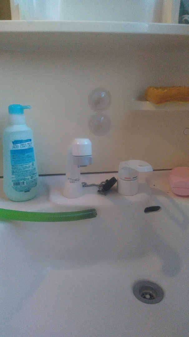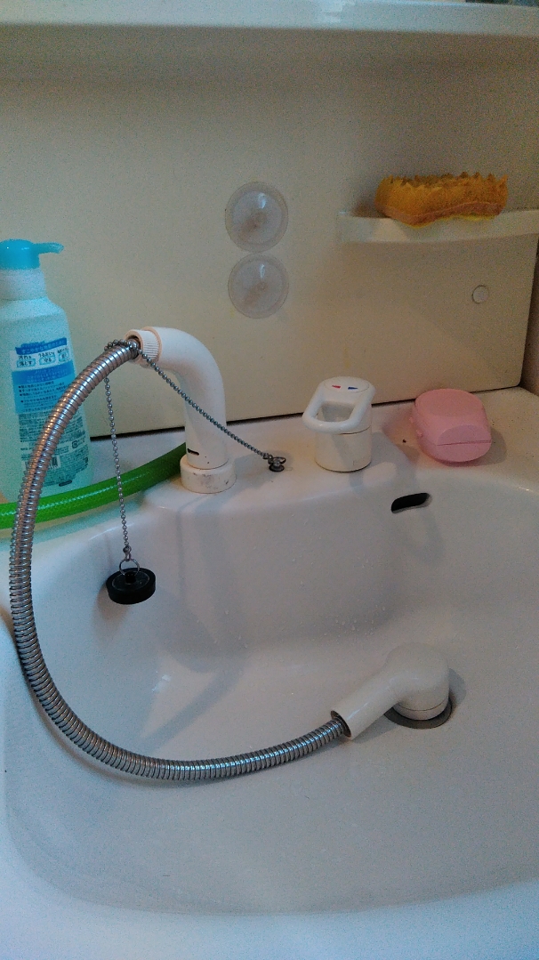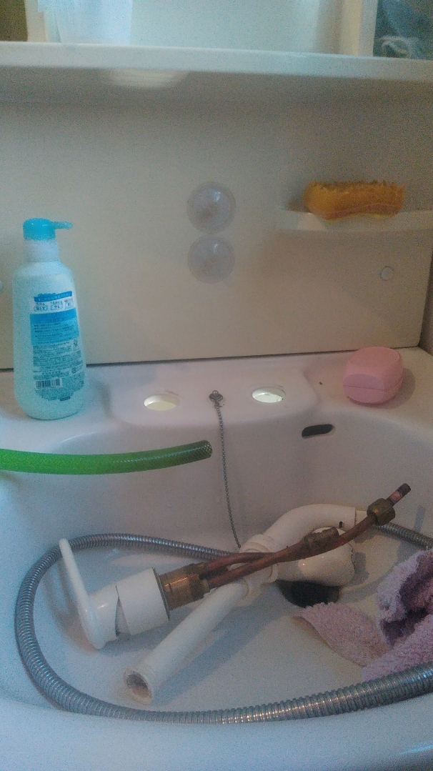 本日は提携会社からの依頼で洗面所シンク下が濡れているいるので見て欲しいとの依頼で行ってきました。拝見すると20年以上、使っている洗面台でシャワーホースの経年劣化による水漏れです。メタルホースの中はゴムになっていて長年、使って亀裂が入ったと思われます。メーカーも今は無いので水栓本体ごとの交換が必要になります。お客様にその旨を話し交換になりました。娘さんにも半分出して貰うの事でした。(;´Д`)