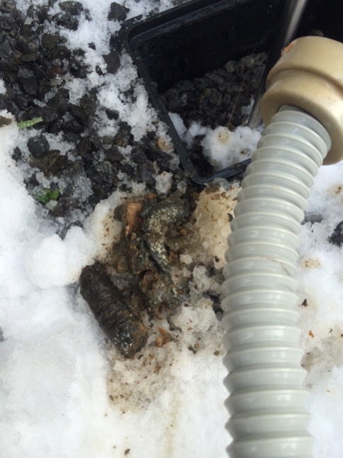一旦水を吸い出して、下の蛇腹ホースを取り除いてみると、漆黒の闇くらいヘドロが詰まっていました。