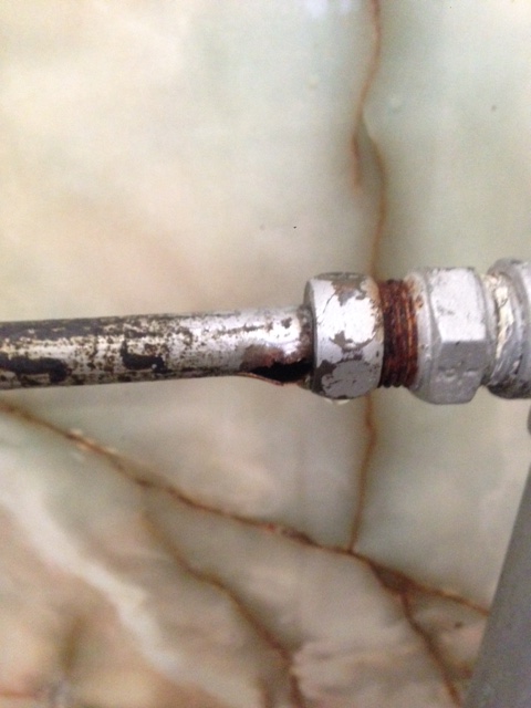 原因は凍結による破裂で、温めて氷が溶けたのがきっかけで割れた部分から噴き出していました。