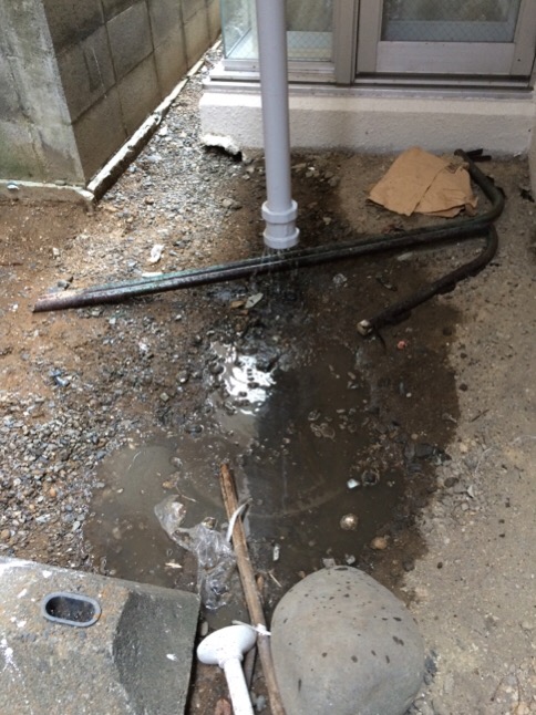 お伺いすると、ベランダにある排水が詰まっているらしく、地面に水が溜まっている状態でした。