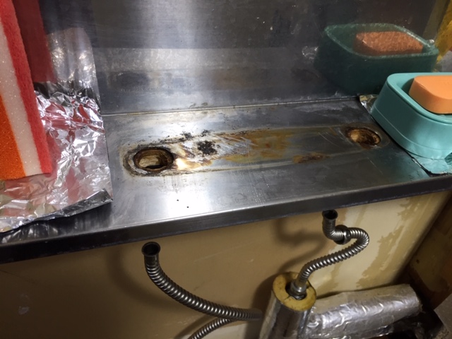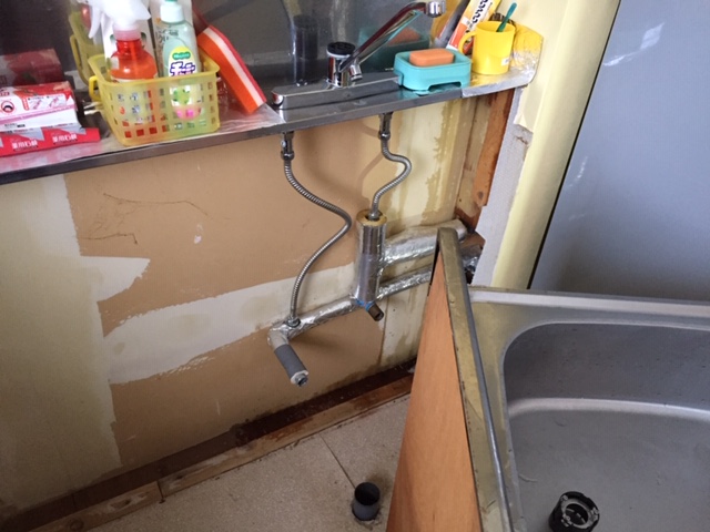 台所シンク下に点検口などがなかったので、シンクを引き出して交換作業を行いました。