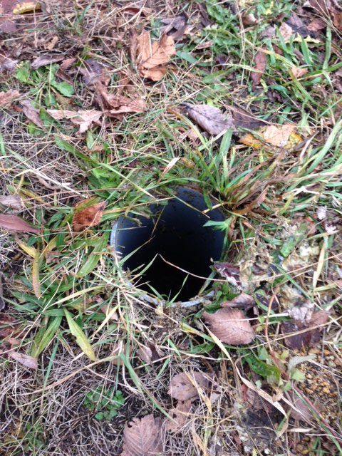 ふと気付くと、草が生い茂った斜面に不穏なものを発見しました、割れた排水管でした。