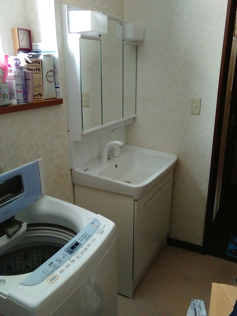 本日は、洗面所の水栓本体から水漏れがするとのご依頼があり出動しました。点検させていただくと水栓本体とシャワーホースから水漏れが確認できます。部品交換も可能ですが、修理箇所が2か所で水栓本体も古いため本体交換を提案。お客様とお話ししていると洗面台本体も調子悪いところがあるとのことで、洗面台ごと交換を提案させていただきました。こちらのお客様のように水栓も洗面台も調子の場合、洗面台ごと交換した方が、新しい洗面台には水栓が付属してあるので金額的にはお得なんですよ!御見積を提示させていただき洗面台交換となりました。洗面台が綺麗になって、お客様も『気持ちが良いいね!』と大喜びでした(^^)v