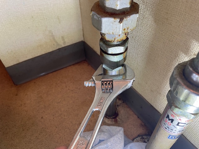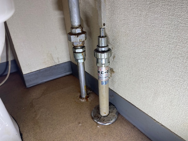 管理会社様からの依頼で、トイレにある天井に突き抜けている配管の床に近い部分から水漏れしているそうです。