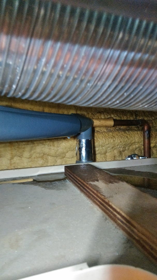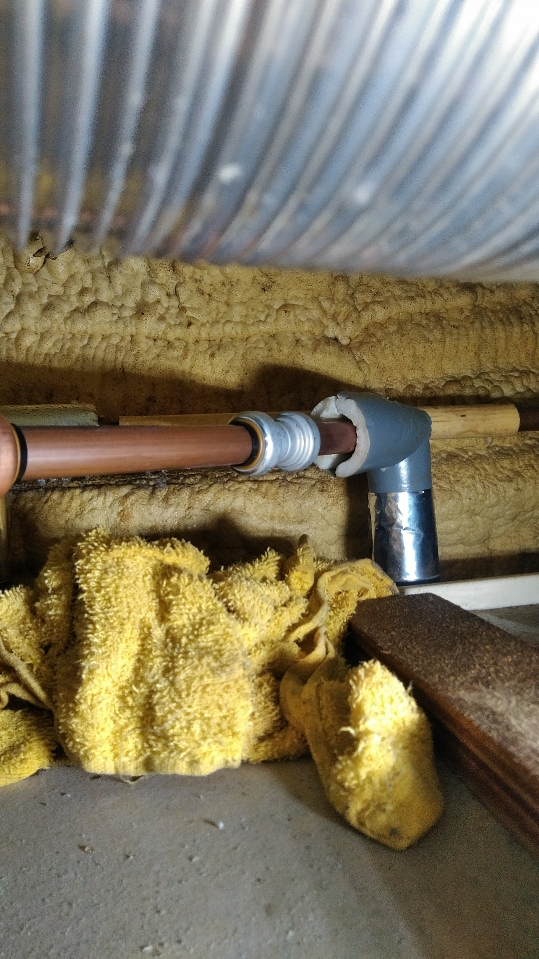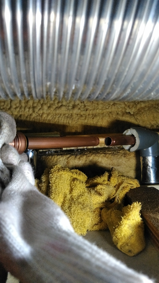 今日は提携会社からの依頼で浴室の天井から水漏れしているので点検修理の案件で行ってきました。拝見すると換気扇の角からポタポタ漏れています。天井の点検口を開けて点検するとお湯側の銅管の保温カバーから漏れていて剥いでみるとピンホールと言って針の先くらいの穴が空いて漏れています。そこを切断してソケットを繋げて水漏れは改善しました。