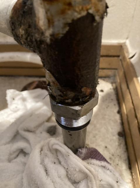 ナットになっている配管の繋ぎ目より水漏れしており、染み出した水は床下に流れ出していました。