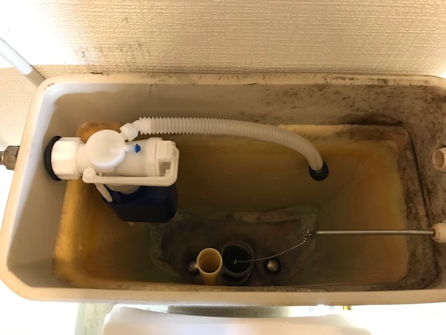 タンク内のフロート弁の取り付け方が逆になっており、レバーの鎖と干渉して引っかかってしまう症状が起きているようでした。