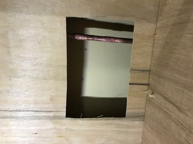 ちょうどガス台の下あたりから水が染み出してきたとのことで、収納内の裏板を開口して調査をしました。