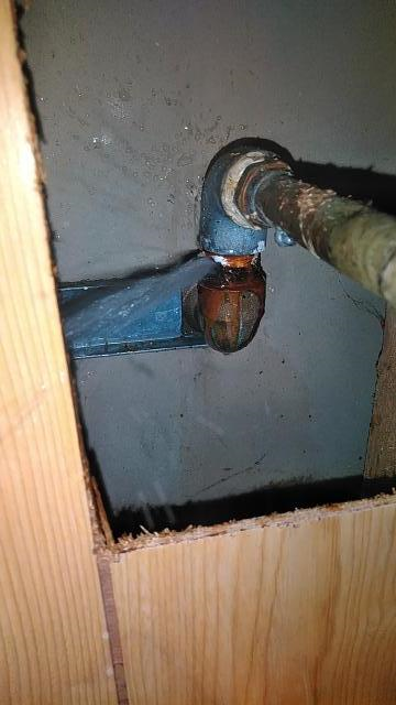 壁を開口して配管を見ると、古くなって錆びた鉄管に穴が開いて水が噴き出していました。