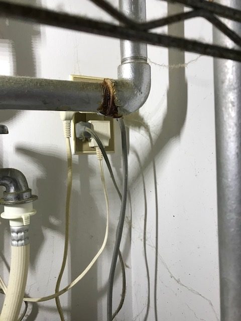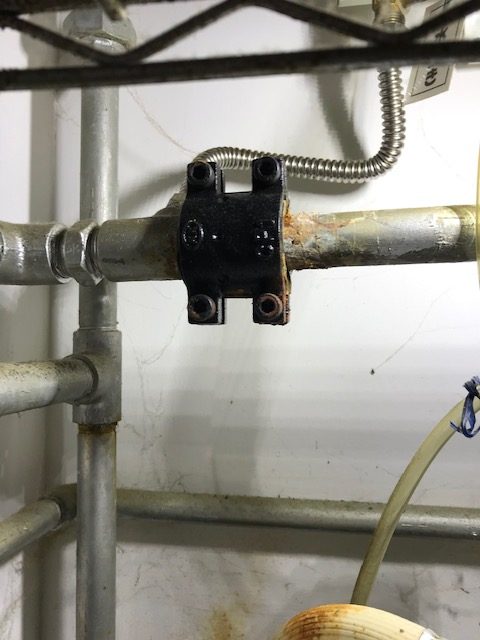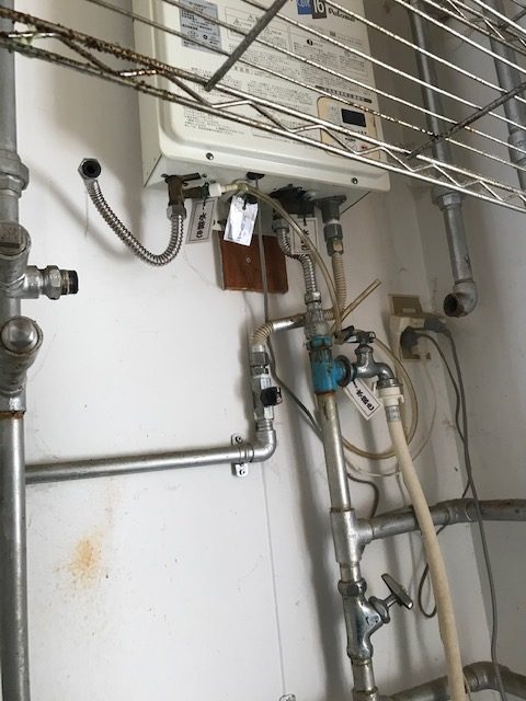 本日は提携会社からの依頼で給湯器の下の鉄管から水漏れしているので修理、点検の依頼で行って来ました。点検すると築年数40年のアパートで以前から鉄管の水漏れ修繕の形跡があり圧着ソケットしている所、エルボ―の繋ぎ目とあちこちがやばそうです。管理会社に連絡し修繕の了承を得て鉄管から錆びないフレキ管に交換し水漏れは改善しました。