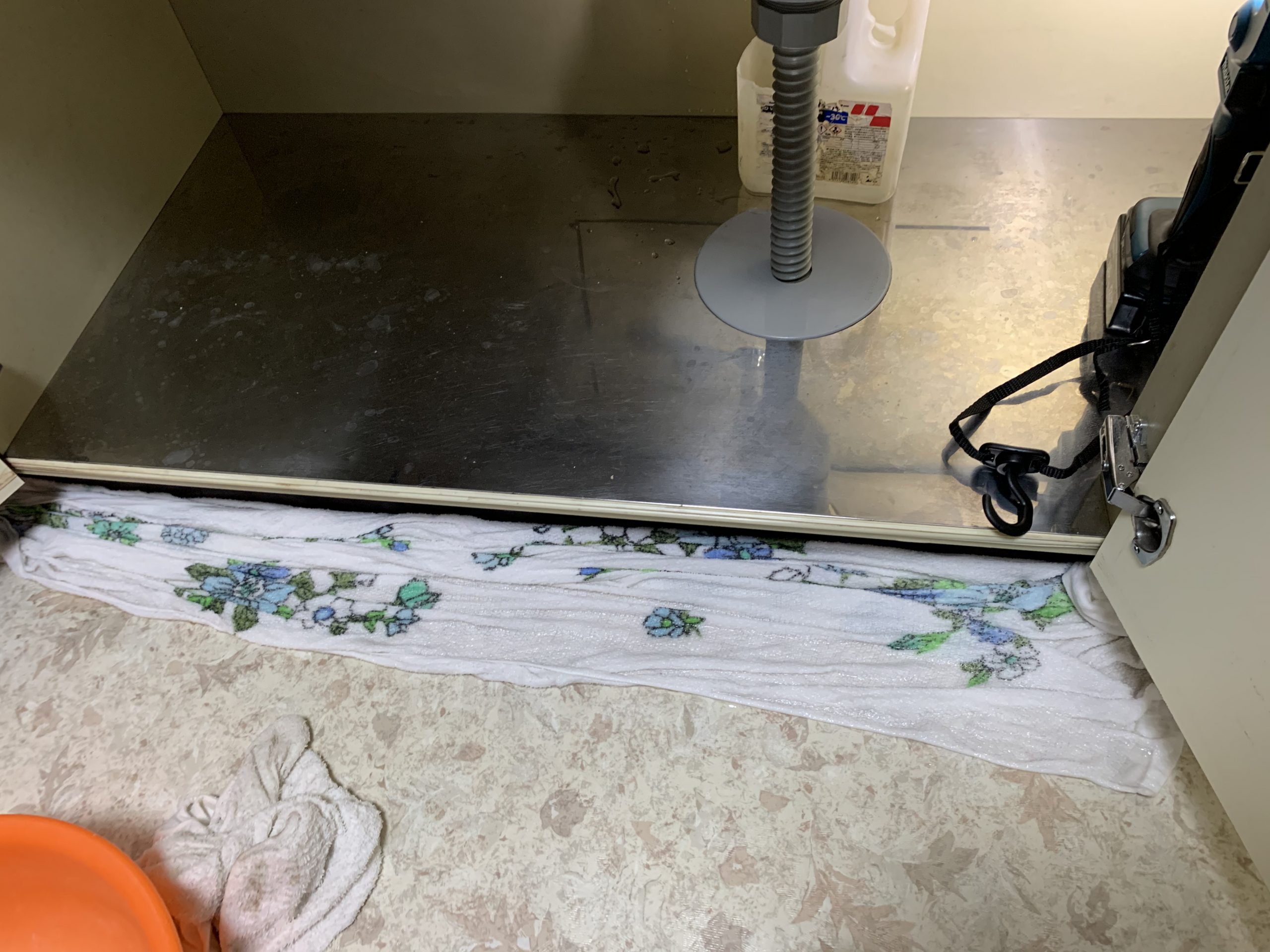 お客様は1週間ほど留守にしていたらしく、きちんと水抜きをして部屋を空けたらしいのですが、帰ってきて水を出したところ台所の床から水漏れしてしまったようです。