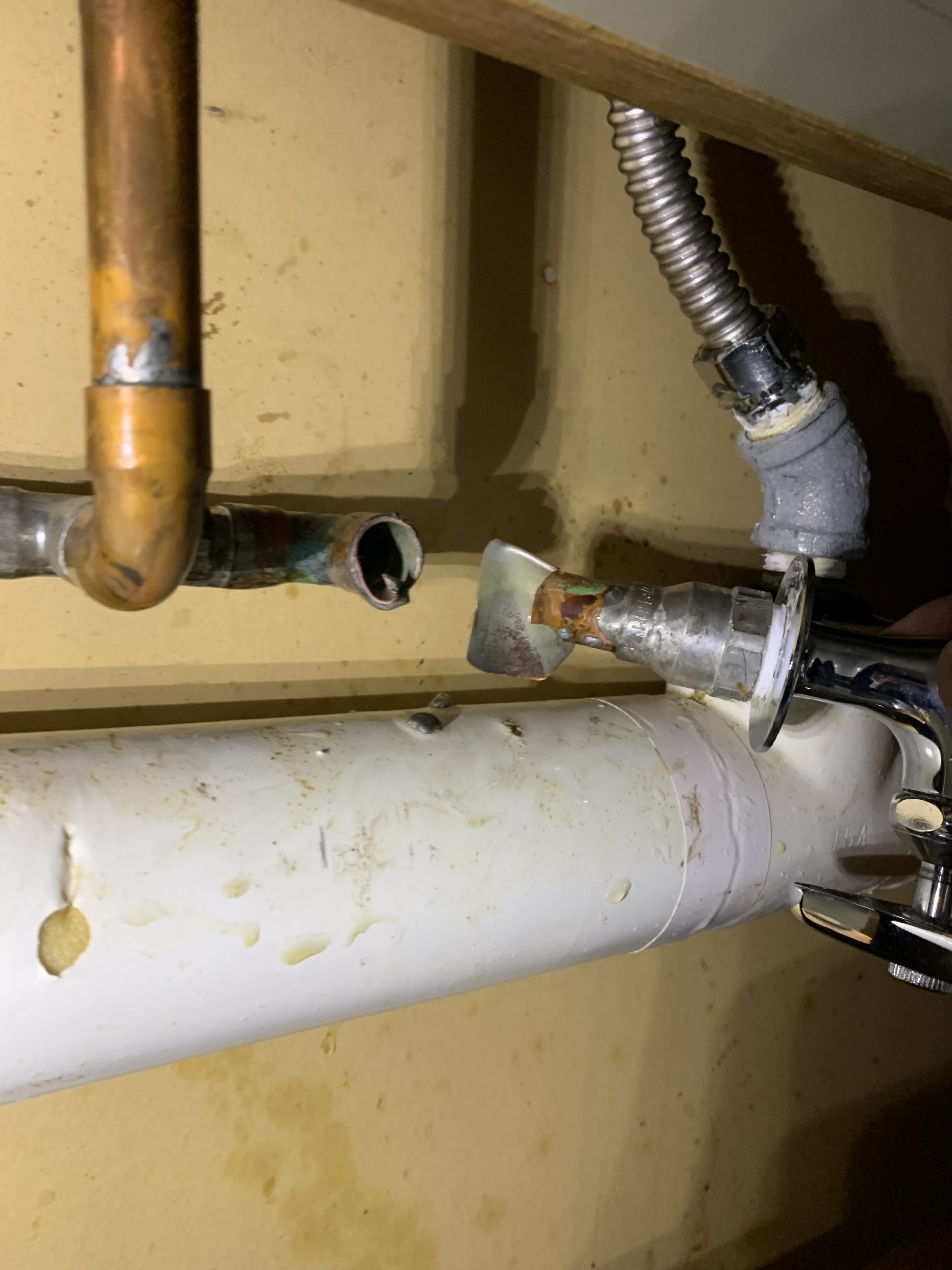台所の裏に水道管があり台所収納内の点検口を開ける必要があるため干渉する水抜き用の蛇口を外そうとしたところグニャッとした感触が!!