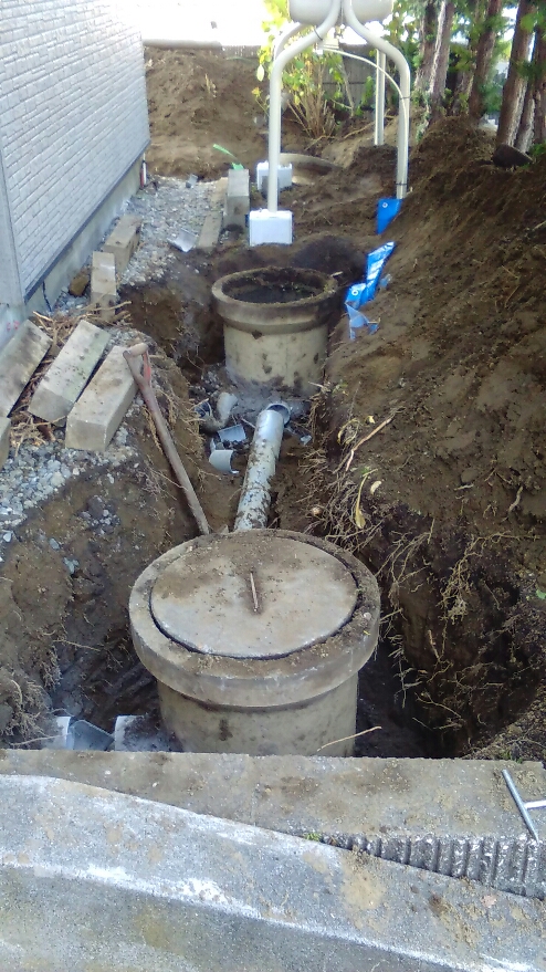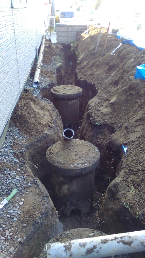 本日は今年初の外排水管の大々的な交換工事をしました。排水桝は30年使っているとても大きいコンクリートの枡で撤去作業が大変でした。。。距離は17メートル。深さ80㎝、4人体制で朝から夜10