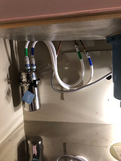 あとは浄水器と給水管を接続させて完了です。飲み水や料理専用としては格好の蛇口ですね。