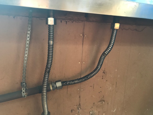 台所を引き出して給水管を見てみると、蛇口へとつながるフレキ管のつなぎ目から水漏れしていました。