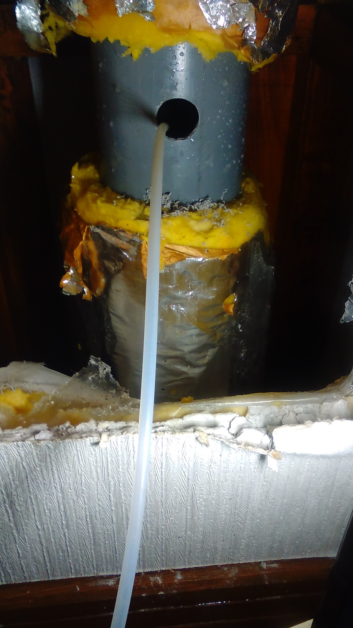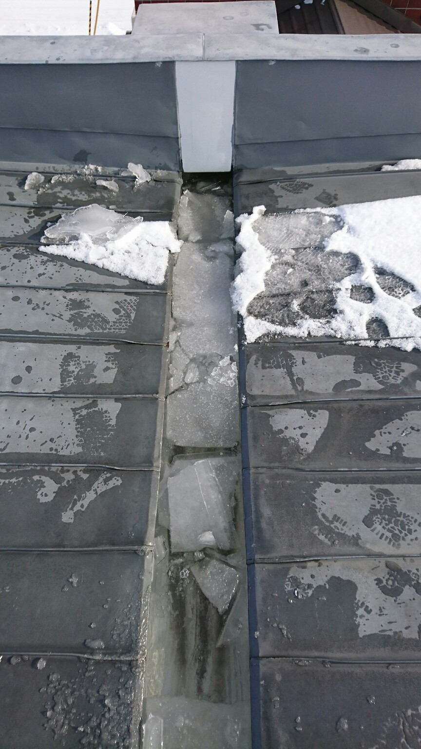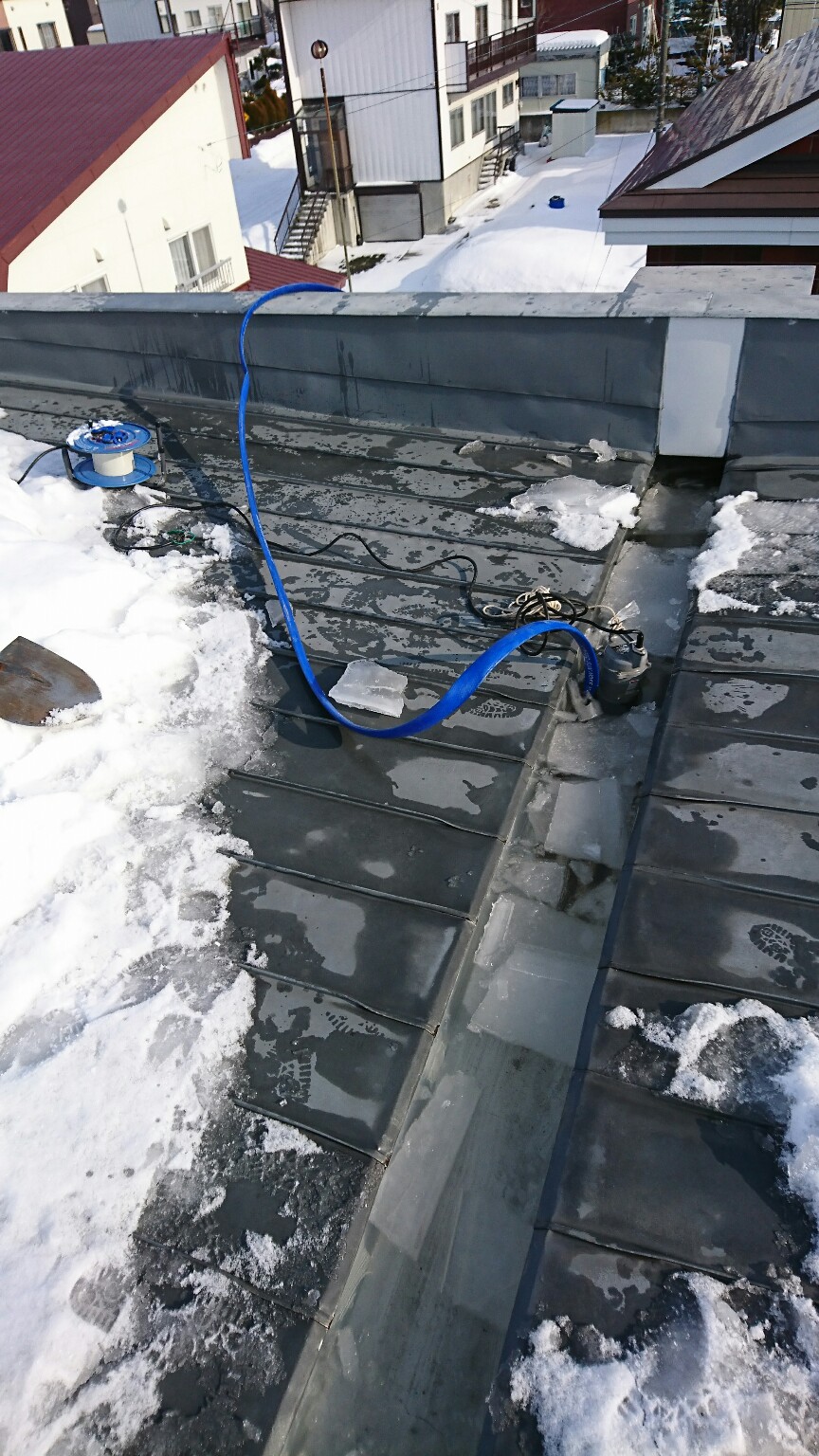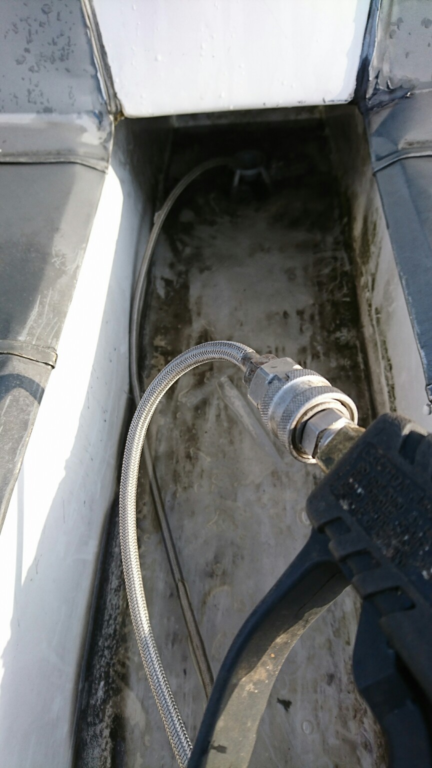 管理会社様からの依頼で管理物件の屋上ドレンが詰まったとのご依頼ありました。屋内まで水が漏水しており天井が落ちそうな状態( ゚Д゚)屋上より高圧洗浄を試みますが改善されません。このよな場合はドレン管内が凍結していることがありますので屋内の壁を開口して排水管に穴を開けて直接蒸気で氷を溶かします。地面から2階の床下の間で凍結しており解氷に時間がかかりましたが、どうにか完了しました。屋上のドレンは春先や秋口にちゃんとメンテナンスをちゃんとしましょう。