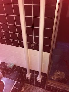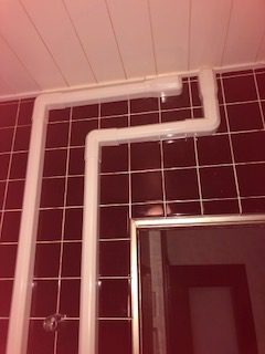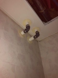 本日は壁の中の水道管が水漏れしたとのことでお伺いしました。お伺いさせて頂くと浴室のの真下の部屋から水漏れしているとの事でした。点検口を確認したところ浴室の蛇口に繋がっている配管からの水漏れでした。通常だと壁に穴を開けて補修などをするのですが丁度開口出来ない位置に配管があり。作業としては露出で配管を部分的に引き直す形となりました。天井から給水管と給湯管を下ろしてカバーをつけて蛇口が付いていた位置まで配管を引いて作業完了です。