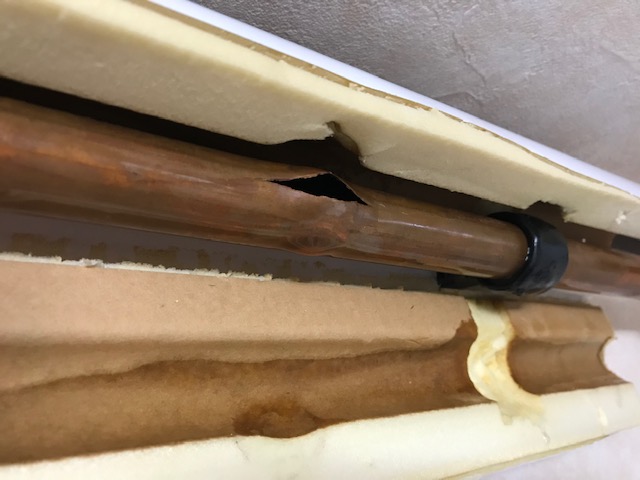 配管に巻かれているガードを取り外すと、入居前に凍結して破裂してしまった配管が見つかりました。