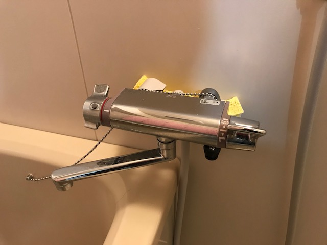 取り付けられている蛇口はサーモスタッド式で、左に温度、右に切り替えレバーが取り付けられています。