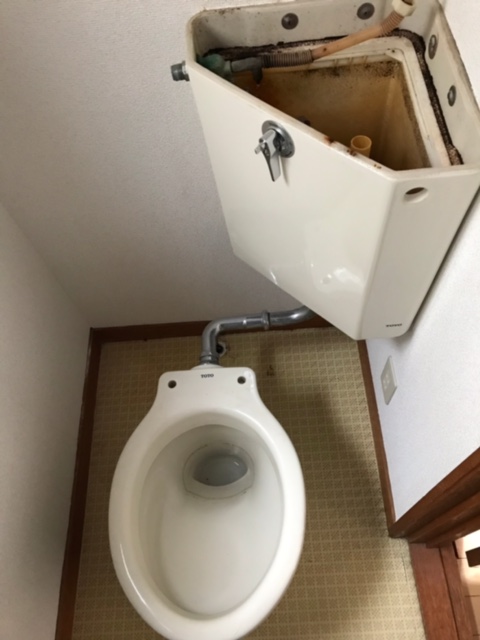今までは隅付タンクと呼ばれる古いものでしたが、便器の上にタンクのあるタイプに変更しました。