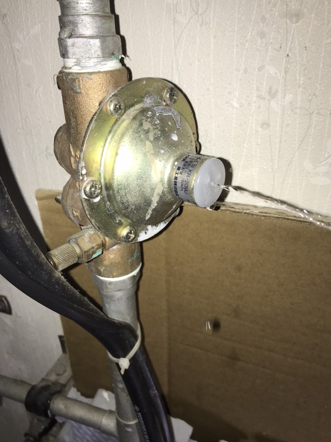 ボイラーのある部屋に入ったら床が水浸しだったため、箇所を探すと元栓付近から水が噴き出していました。