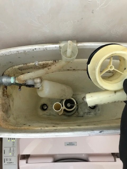 原因はオーバーフロー管というものの破損で、フロート弁一式の部品を交換することで症状は改善しました。