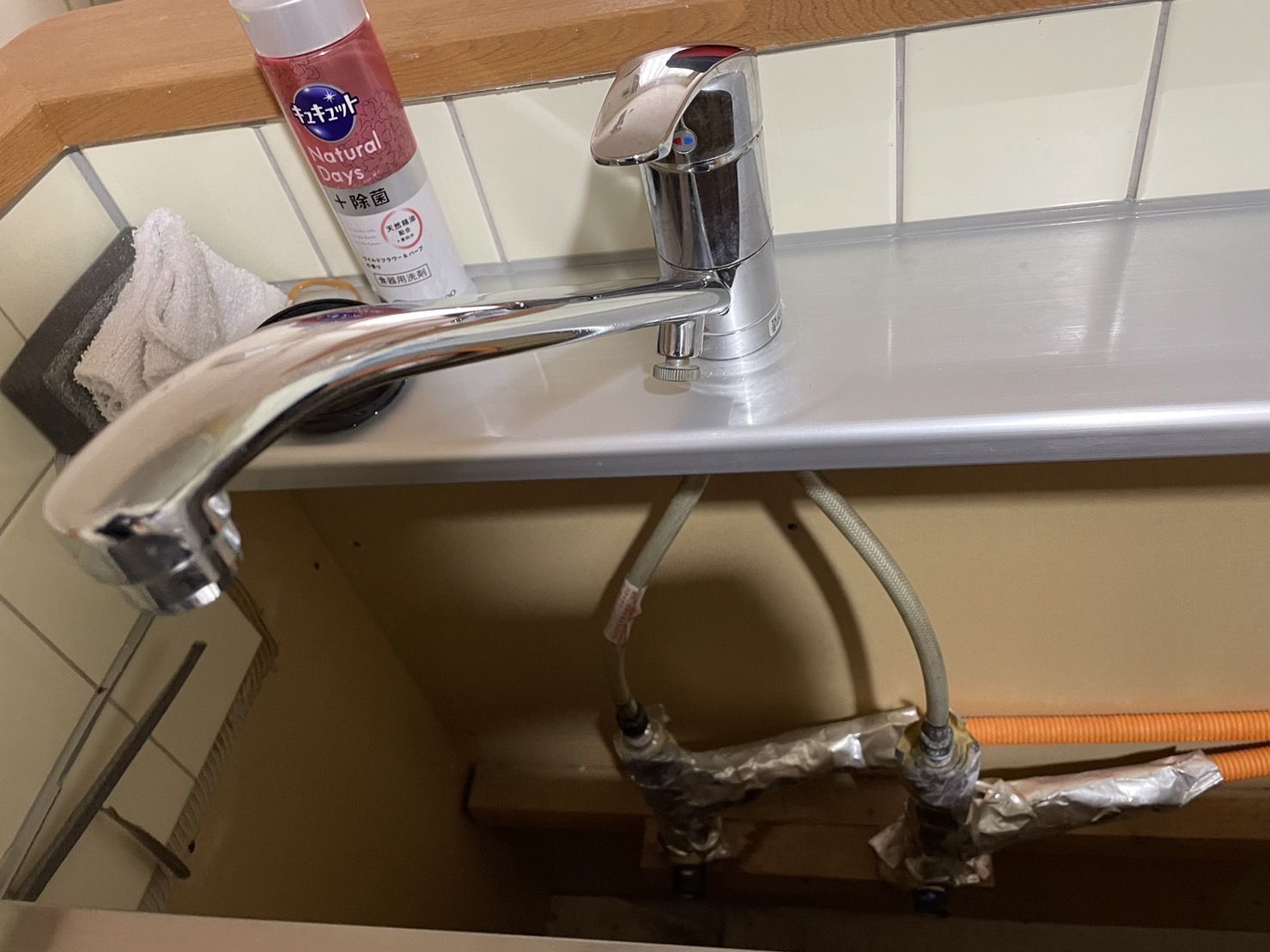 台所裏から若干漏水音がするので、一旦シンクを外してみると、蛇口の根本から水漏れしているのがわかりました。