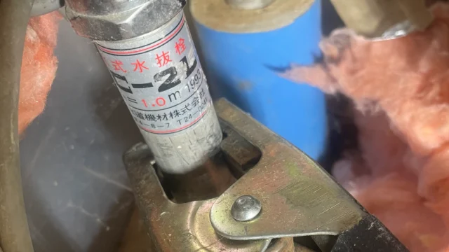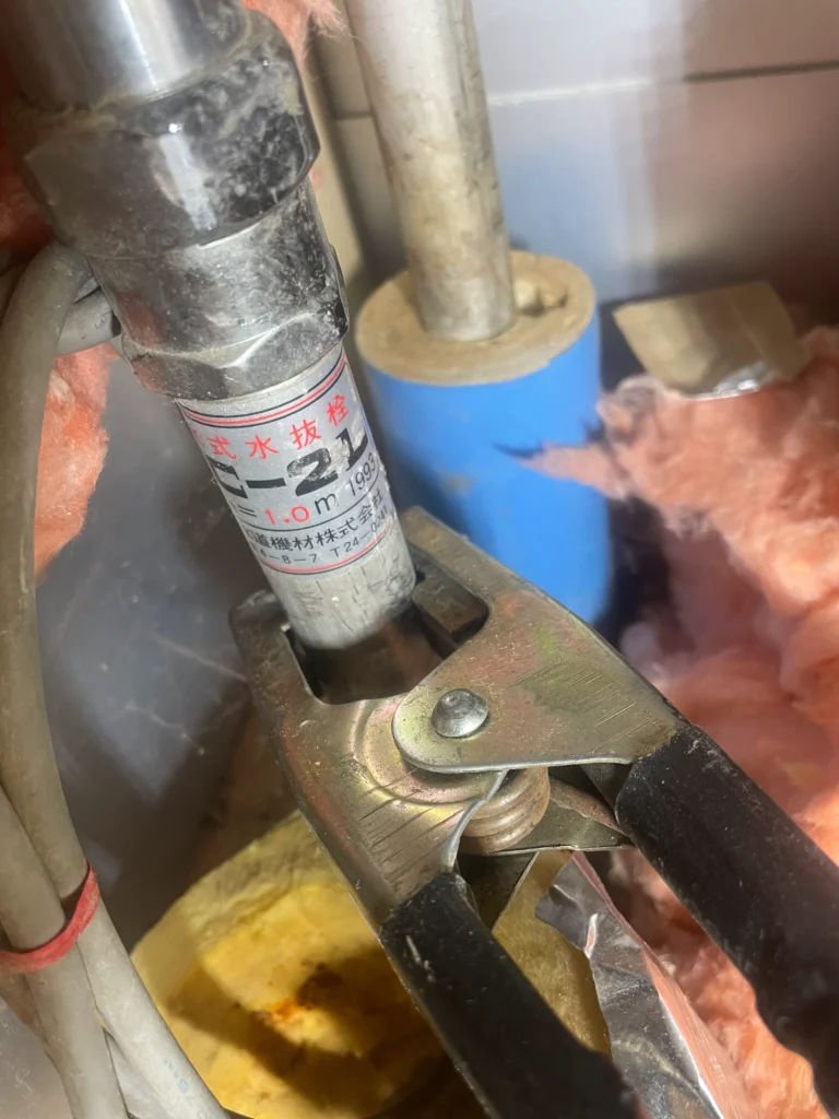 江別市にて、水抜き栓のレバーが最後まで下がらないとのご依頼をいただきました。点検の結果、内部の固着および劣化が原因で、ロット棒が抜けない状態でした。パッキン交換は行えませんでしたが、調整作業によりレバー操作は可能となり、水の勢いもお客様に確認いただいています。