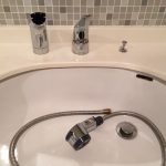 マンションにて洗面所蛇口の水漏れ対応でお伺いしました。蛇口を使用すると、シンク下の扉内に水が漏れるとのことでした。調査の結果、引き出し式ホースとシャワーヘッドの接続部から漏水している状態でした。使用年数も長かったため、ホースとヘッドを交換し、水漏れは解消しました。