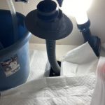 台所収納内から排水ホースを外し、落としてしまった異物もろもろを除去することで詰まりは解消しました。作業前
