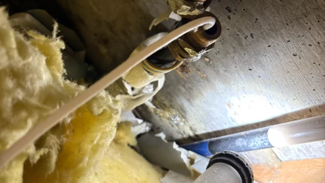 札幌市厚別区大谷地の賃貸住宅にて、台所の水漏れ修理のご依頼をいただきました。点検したところ、給湯管に小さな穴が開いており、長年の使用による劣化が原因と判断しました。該当箇所は銅管を補修し、水漏れが再発しないよう丁寧に施工しています。作業後は正常に使用できることを確認しました。